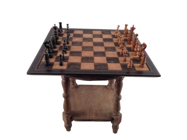 Beautiful Small Chess Table With Inlays And Staunton Figurines