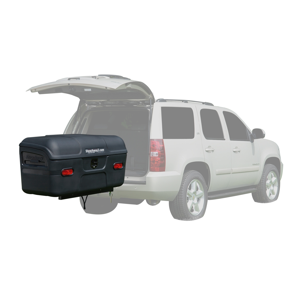 Stowaway max hitch cargo box with swingaway frame 16 cubic feet capacity black or ivory. Hitch mounted for ground level loading with a swingaway frame for access to the back of your vehicle. Our max cargo box is designed for class iii and class iv 2 hitches with a 300 lb tongue weight minimum for both the hitch and your vehicle.